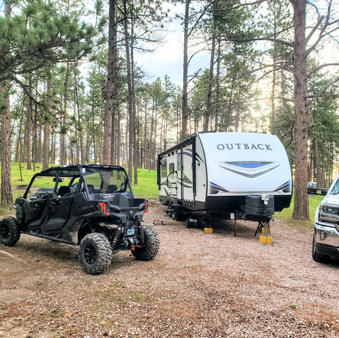 Yesterday was a busy day. We departed early since we had a number of stops in Rapid City before we moved on to our final destination in Custer SD. I found a shop that will straighten/align the axles on the trailer and possibly upgrade the leaf springs. We also picked up our UTV and trailer before heading to Custer SD. We are staying at the Big Pines Campground that is just outside Custer. We got a really nice spot tucked under the big pines. We also are very close to National Forest Trail Access. We jump on the Hwy for 1 mile and head off into the woods!